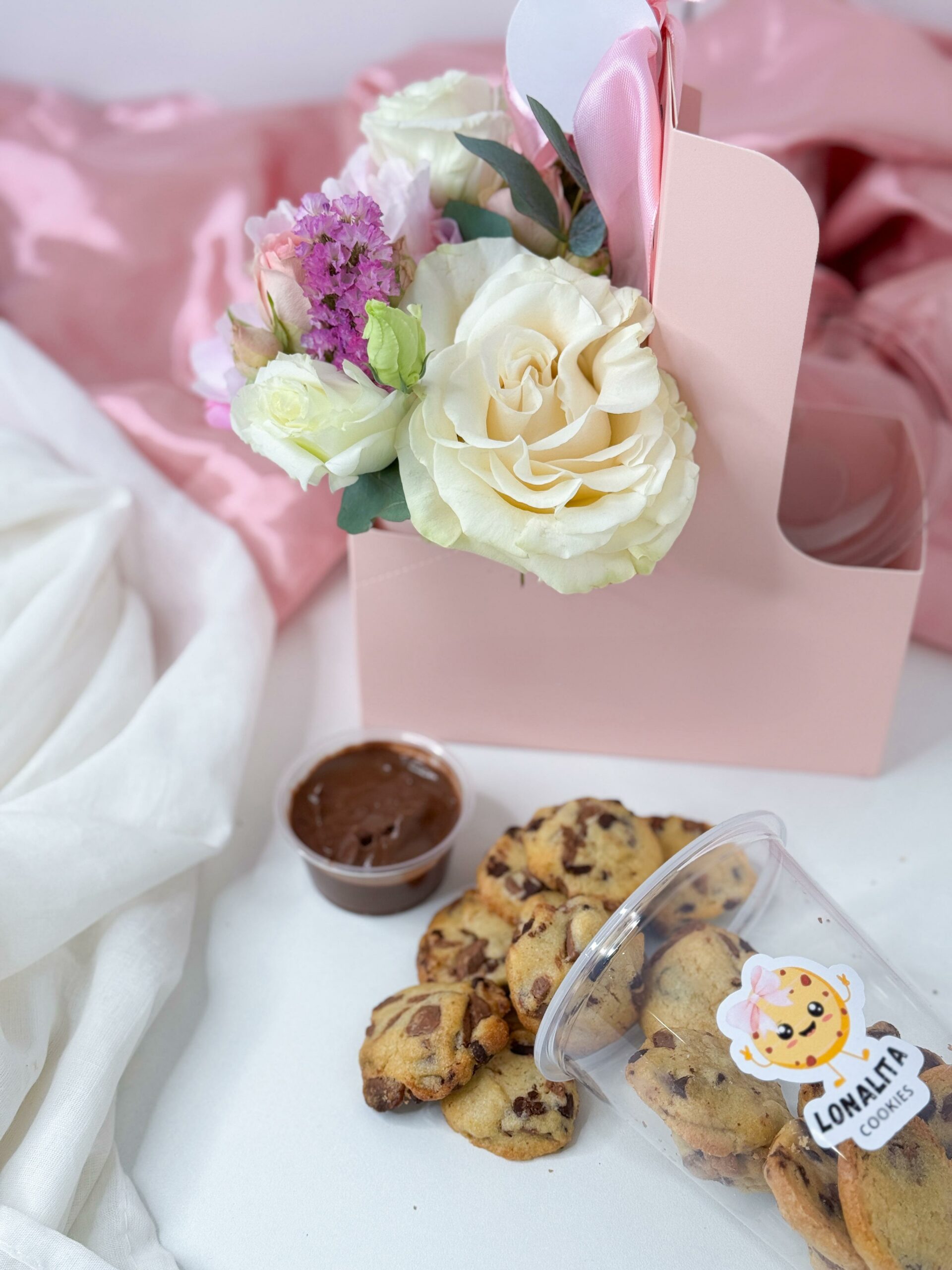 Composition Tendresse : le coffret de fleurs + Mini cookies